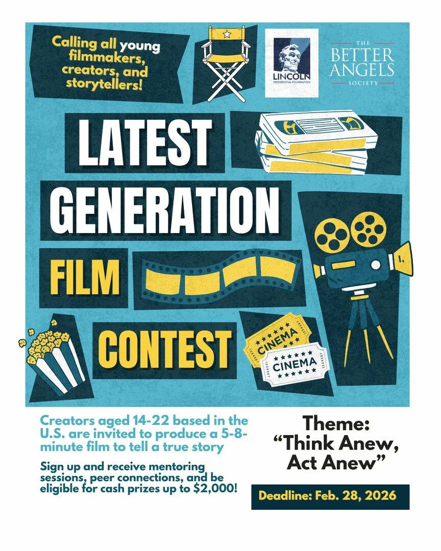 The Latest Generation Film Contest invites young filmmakers ages 14–22 from across the United States to create compelling short historical documentaries (5–8 minutes) that bring American history to life. Presented by Lincoln Presidential Foundation and The Better Angels Society.